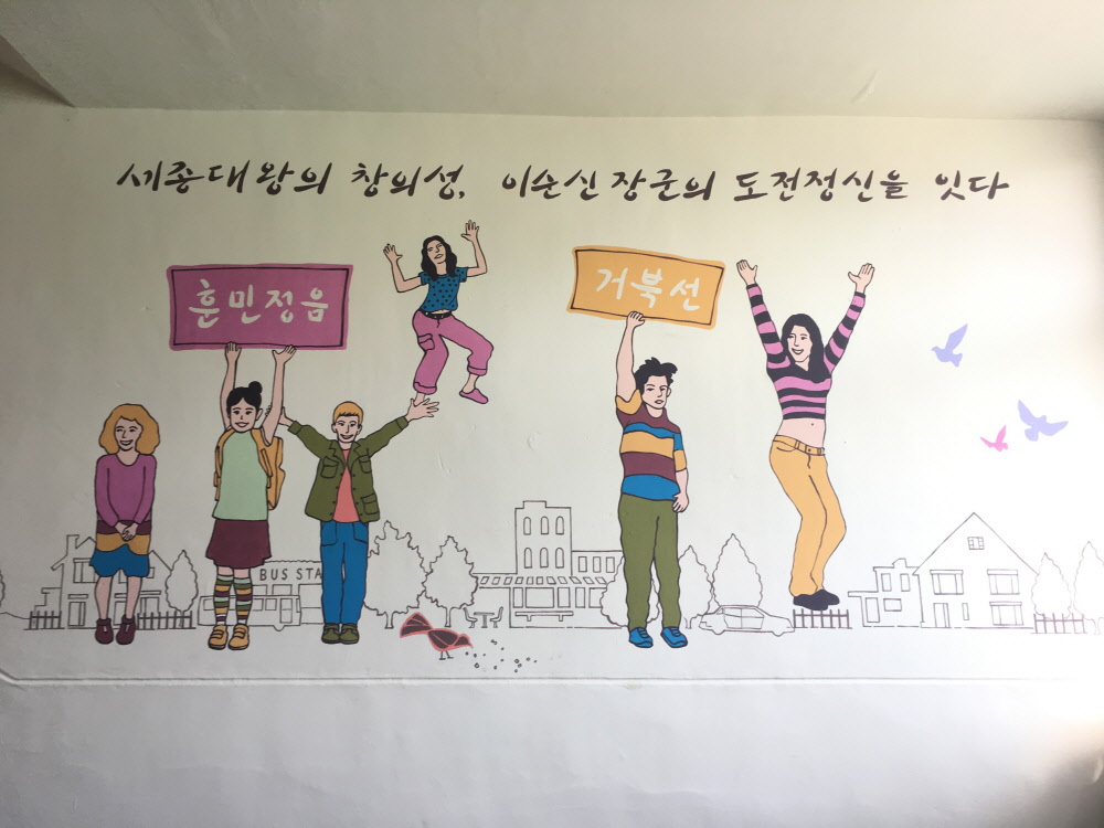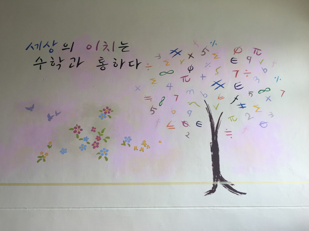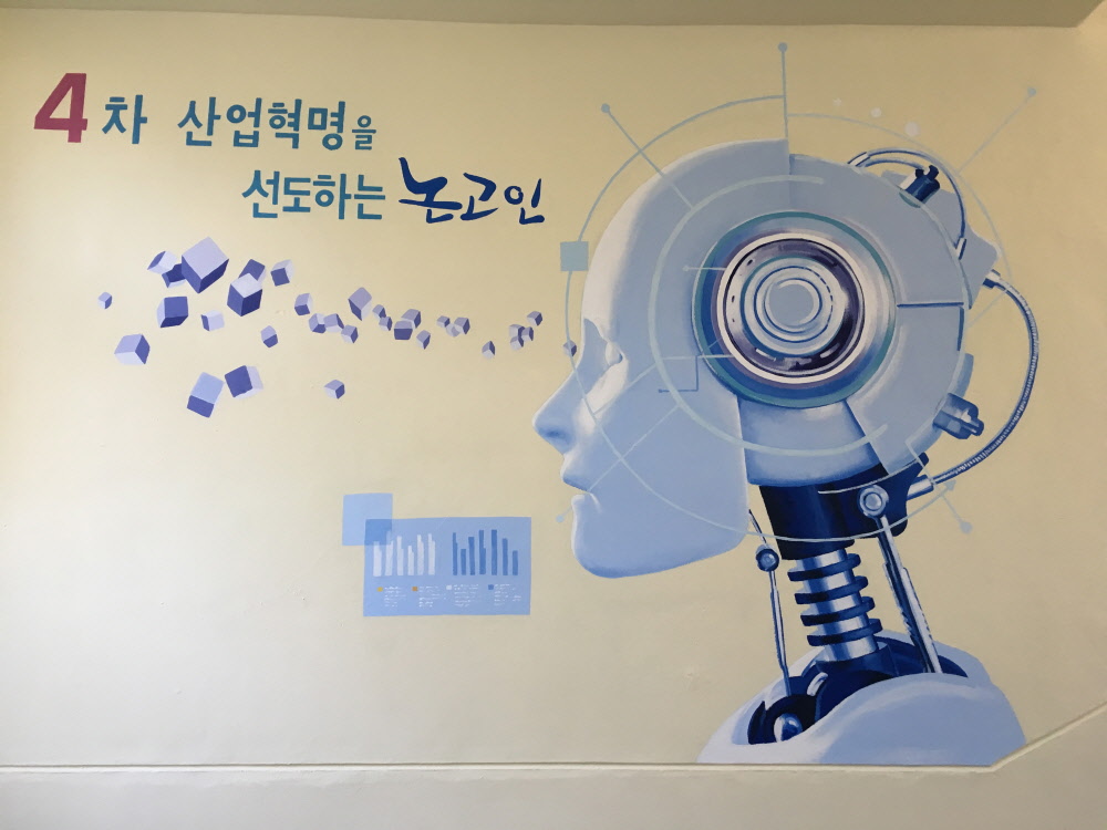 4차 산업혁명을 상징하는 미래형 테크 콘셉트 벽화입니다.인공지능 로봇의 측면 실루엣과 데이터 그래픽 요소를 결합해 기술·융합·혁신의 이미지를 직관적으로 표현했습니다.차분한 블루 톤과 정제된 그래픽 구성으로 전문성과 신뢰감을 강조했으며,문구와 시각 요소가 조화를 이루어 공간의 메시지를 명확하게 전달합니다.교육기관·연구시설·공공기관에 적합한 디자인으로,미래 비전과 기관의 방향성을 시각적으로 각인시키는 콘셉트 중심 벽화 시공 사례입니다