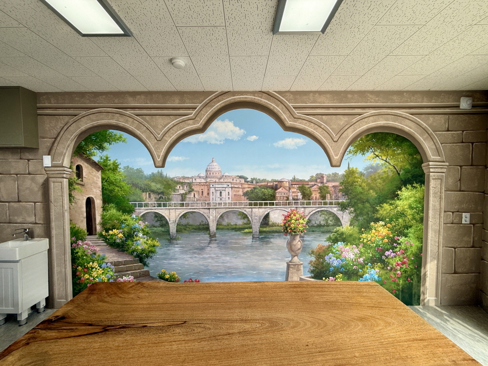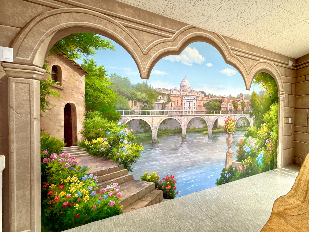 실내 공간에 창문이 열린 듯한 풍경을 만들어주는 유럽 풍경 입체 벽화입니다.
