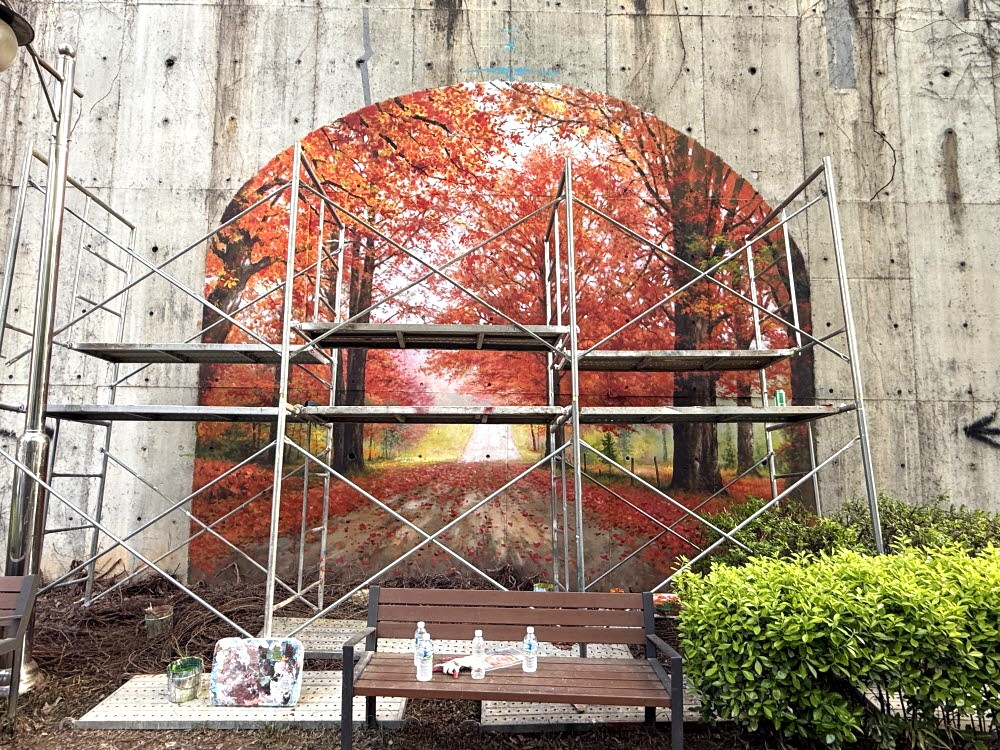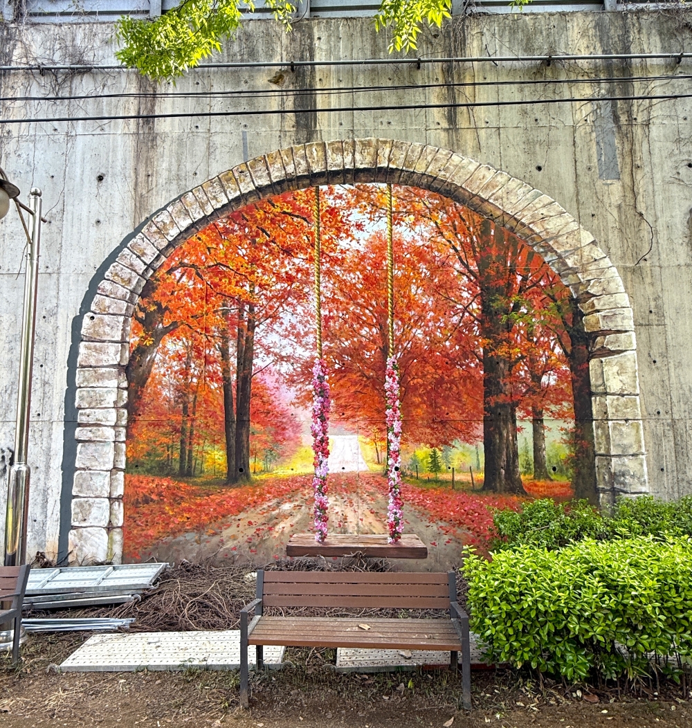 아치 안쪽에는 가을 숲길이 원근감 있게 표현되어 붉은 단풍 사이로 길이 깊게 이어지는 느낌을 줍니다.